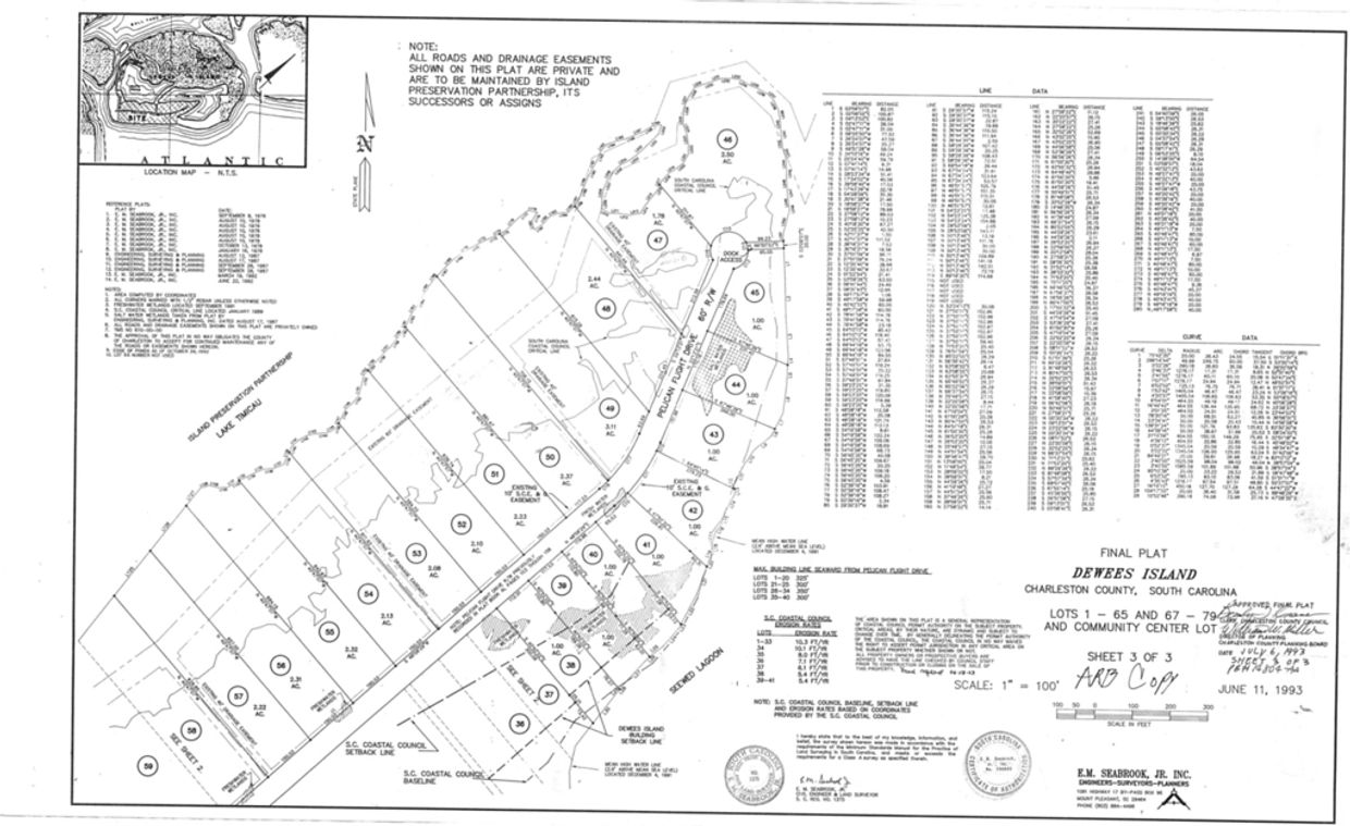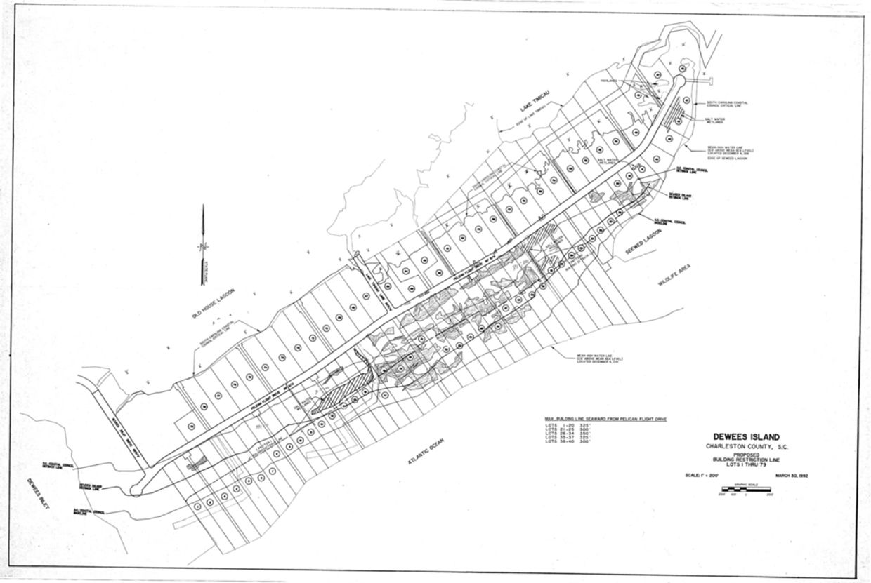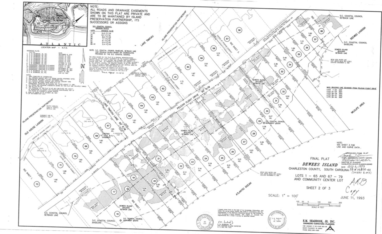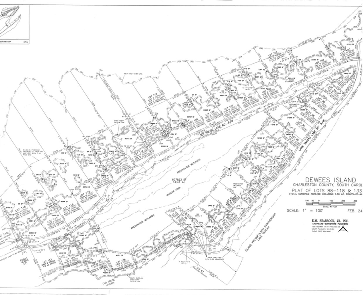 We’ve collected a number of maps and plats over the years. They are here below: remember that you’ll want to have your own tree survey done, and many of these may even be out of date. Seen above is the original master plan. This covers lots along Dewees Inlet drive. Since this plat was drawn, Lot 1 has been subdivided into two, and the line between lots 2 and 3 has shifted.